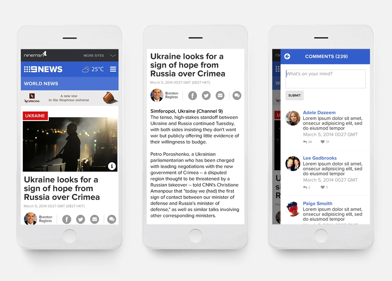 Redesign of the 9NEWS website (Australia's leading news network). I was responsible for leading the concepting phase of the mobile website together with another designer who lead the desktop version parallel to me.